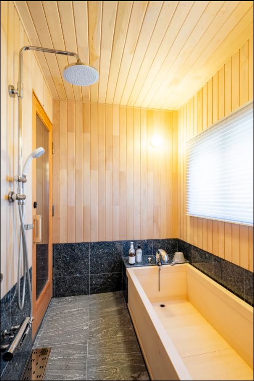 リビングから外に出られる広いバルコニーでバーベキューもお楽しみください。 軽井沢の済んだ空気の中の森でのバーベキューは格別です。 小型の炭火用バーベキューコンロもあります。 食事・サイクリングを楽しんだ後は本ヒバ造のお風呂でゆっくりと汗を流してください。